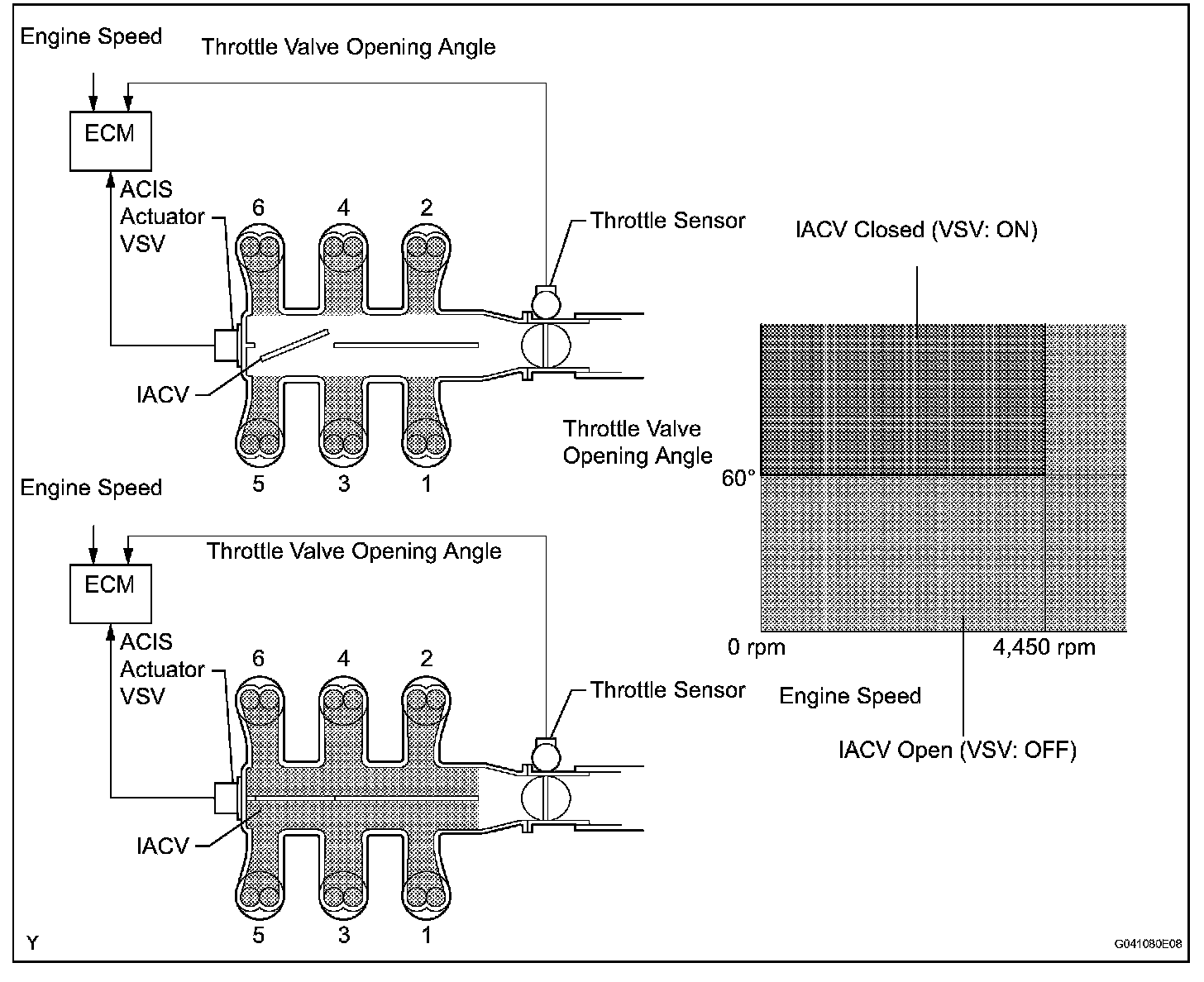 When the engine speed is between 0 and 4,450 rpm and the throttle valve opening angle is 60° or more, the ECM supplies current to the VSV (ON status), to close the IACV. Under other conditions, the VSV is usually OFF and the IACV is open.