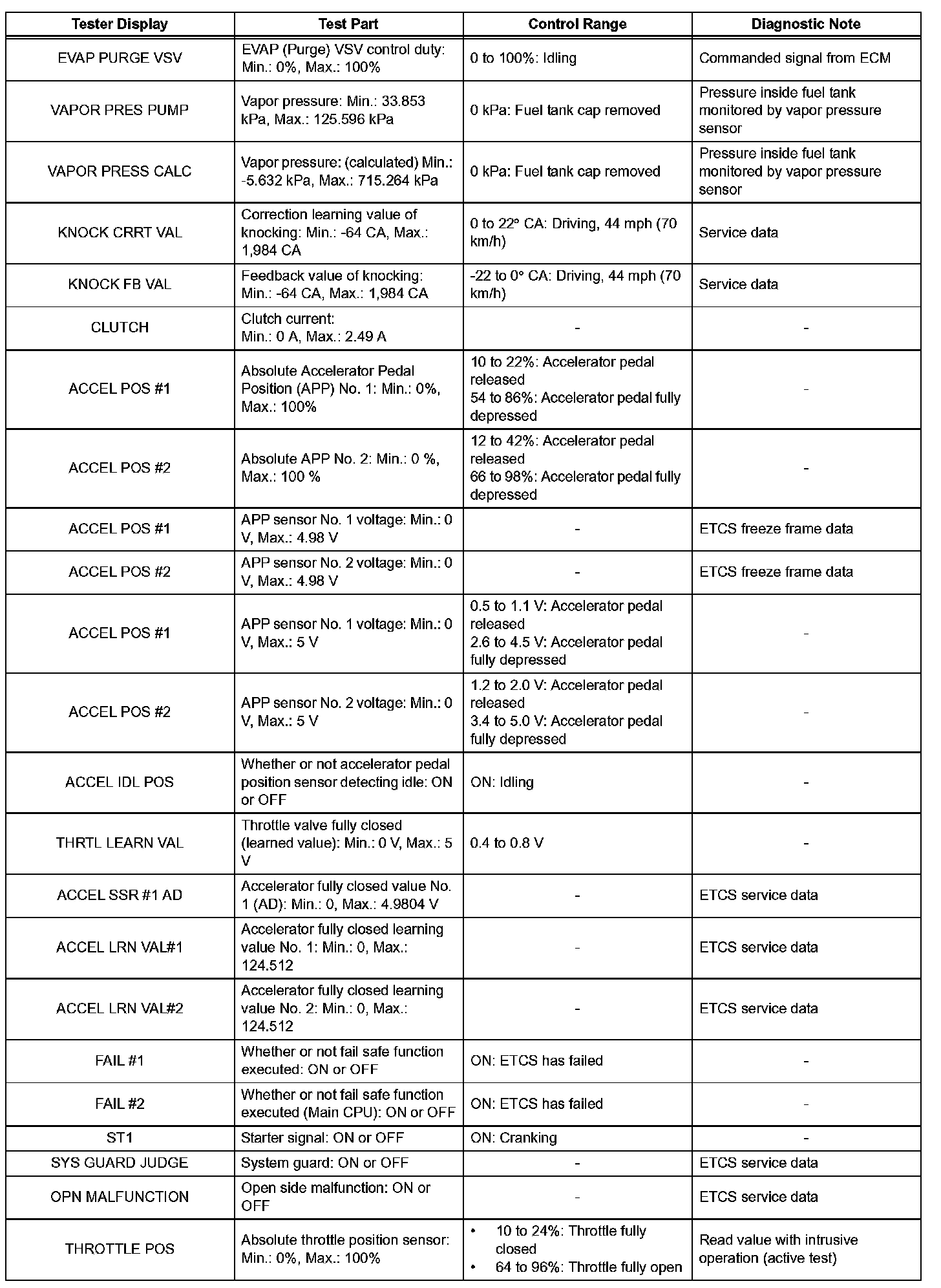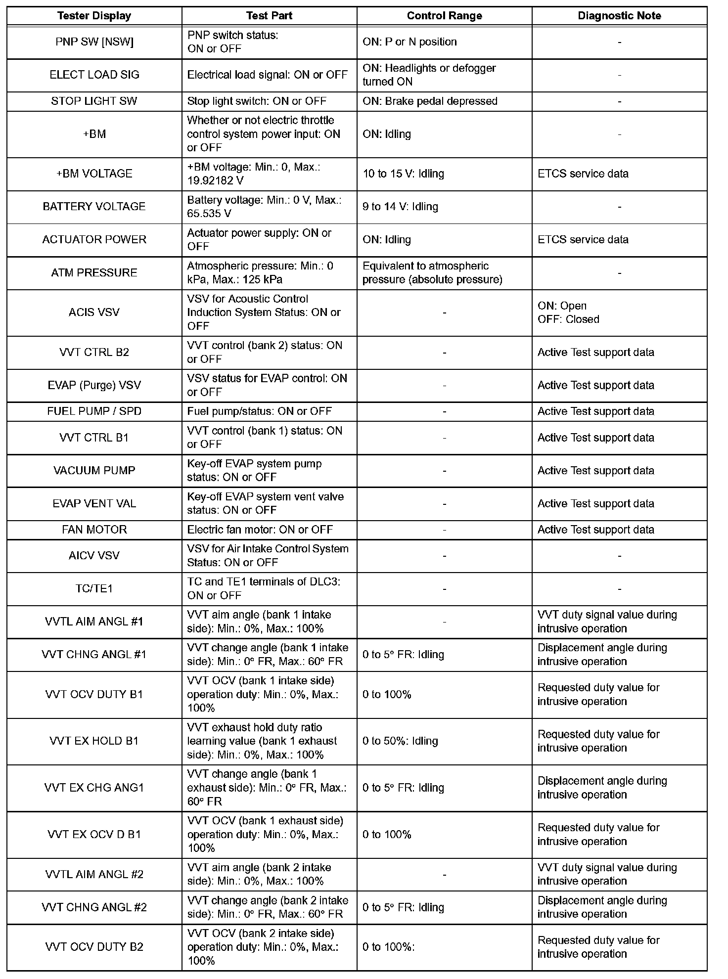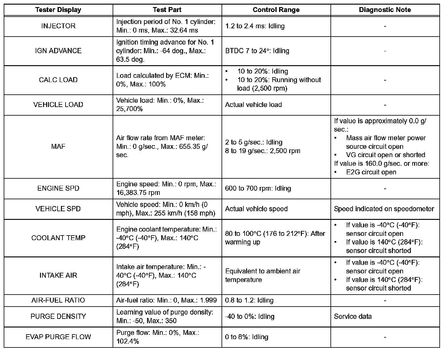 DATA LISTHINT: Reading the DATA LIST displayed on an intelligent tester enables values, including those of the switches, sensors, and actuators, to be checked without removing any parts. Reading the DATA LIST as the first step in troubleshooting is one method to shorten diagnostic time.