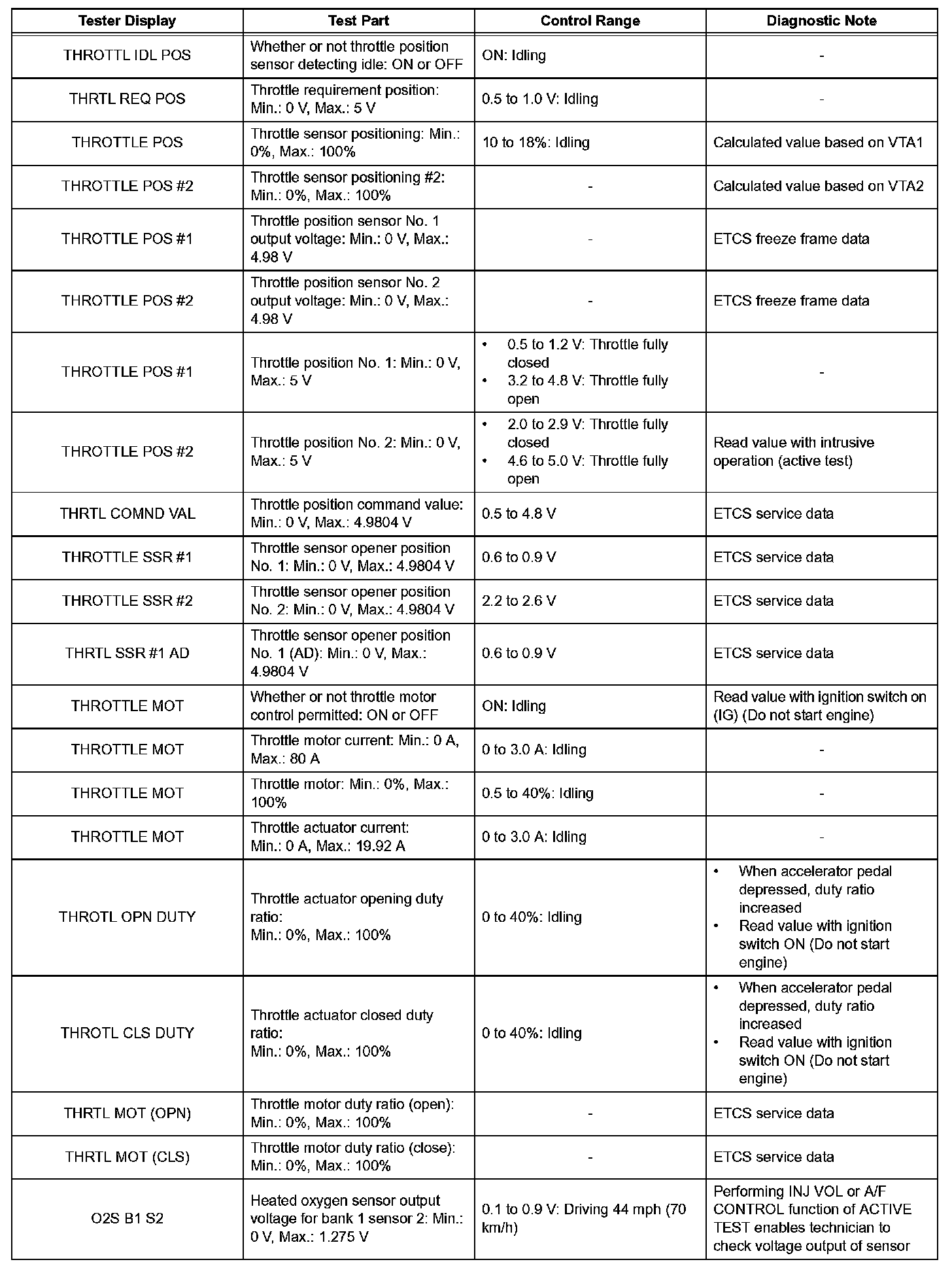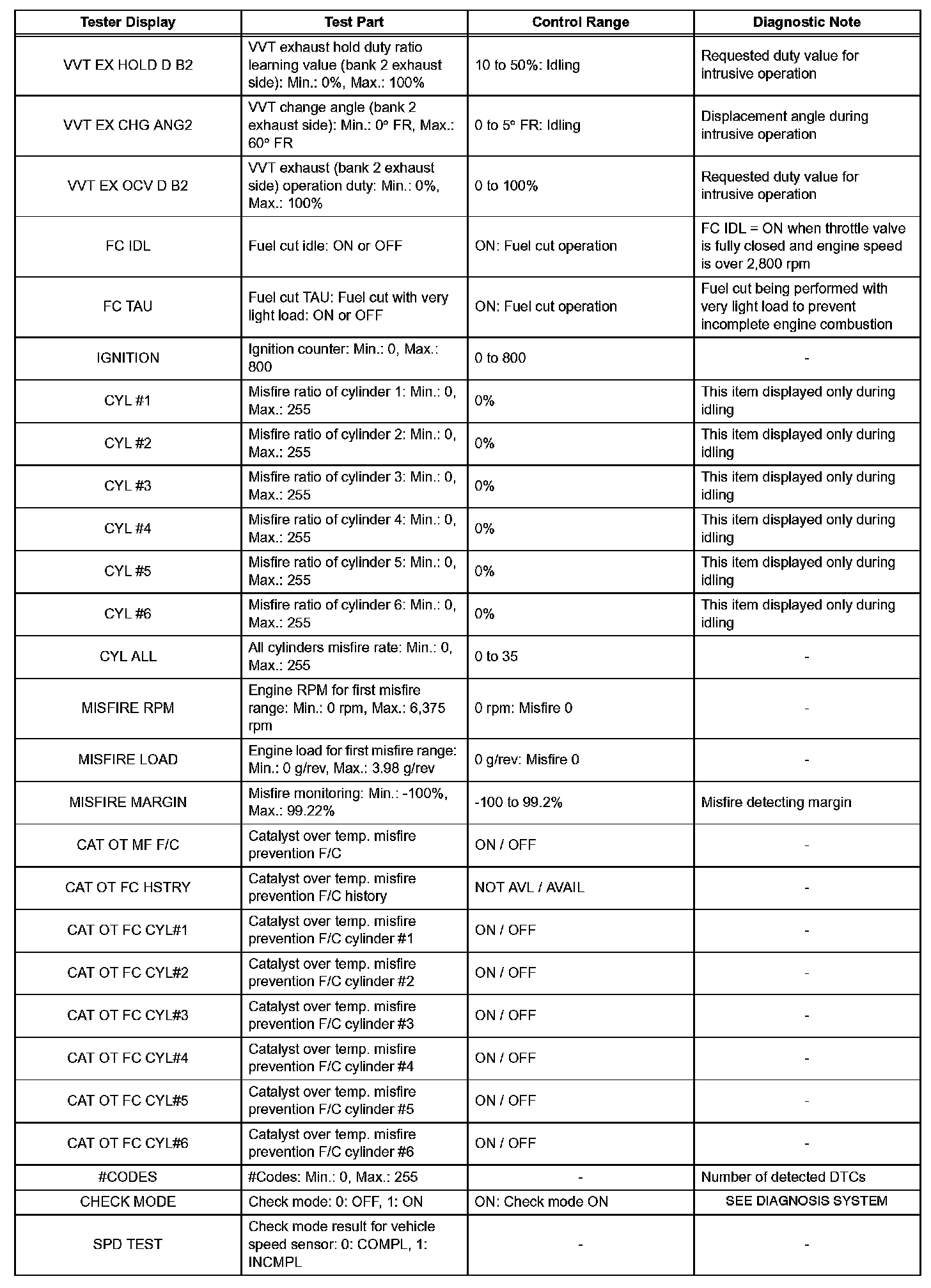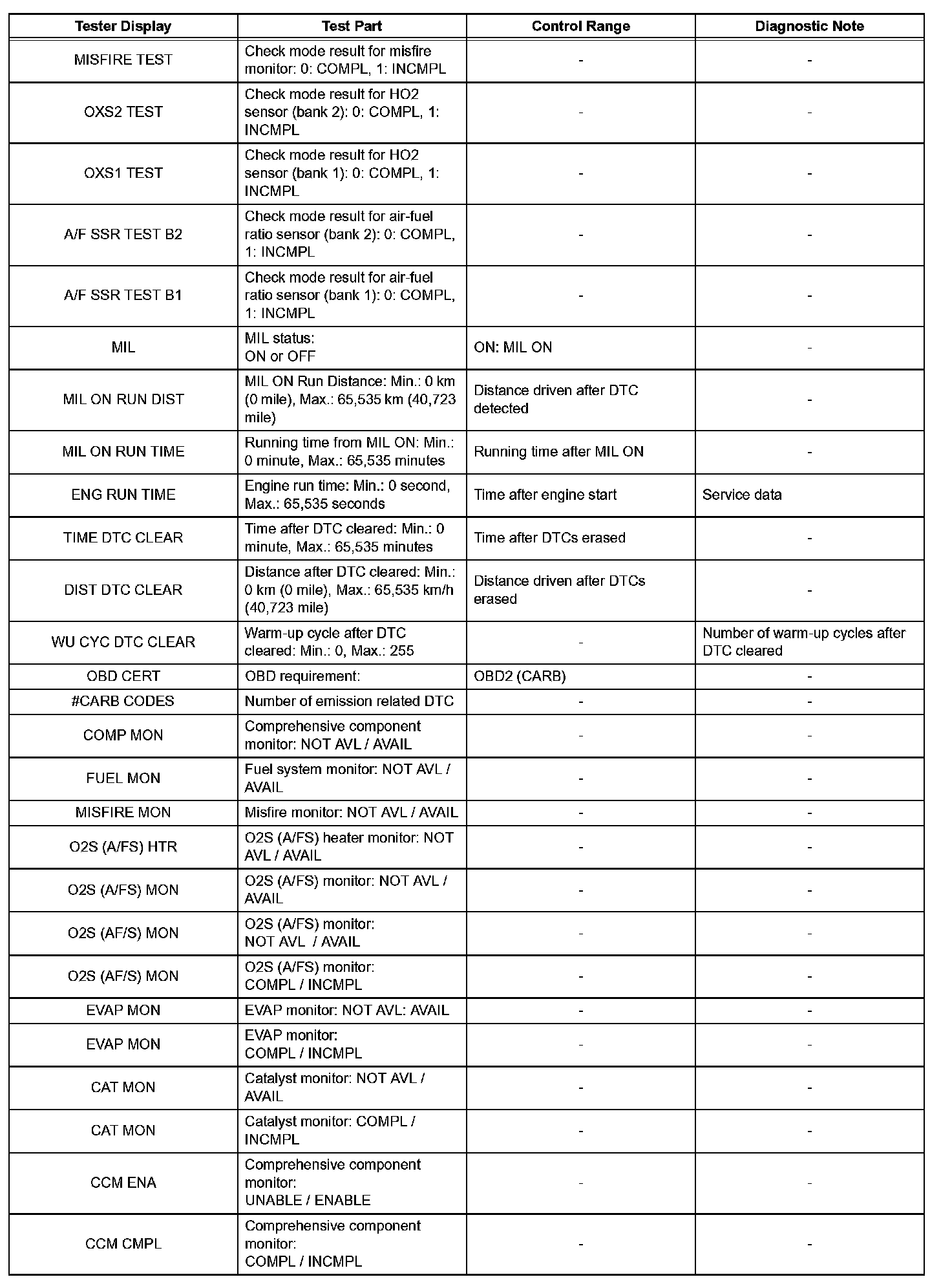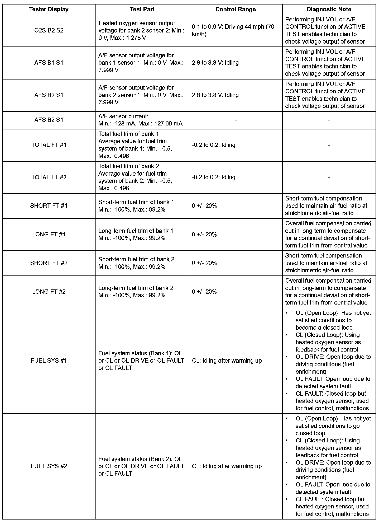 DATA LISTHINT: Reading the DATA LIST displayed on an intelligent tester enables values, including those of the switches, sensors, and actuators, to be checked without removing any parts. Reading the DATA LIST as the first step in troubleshooting is one method to shorten diagnostic time.