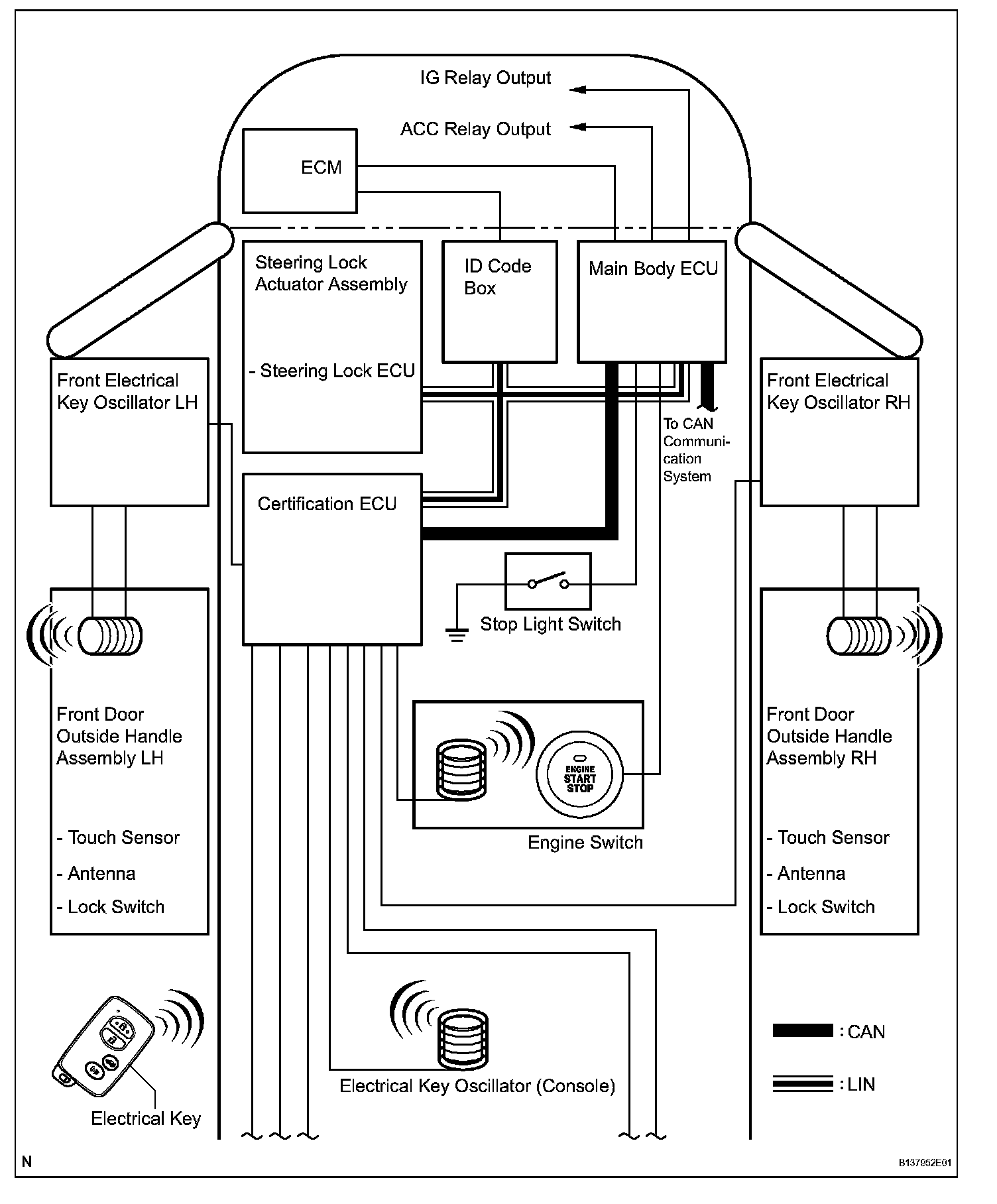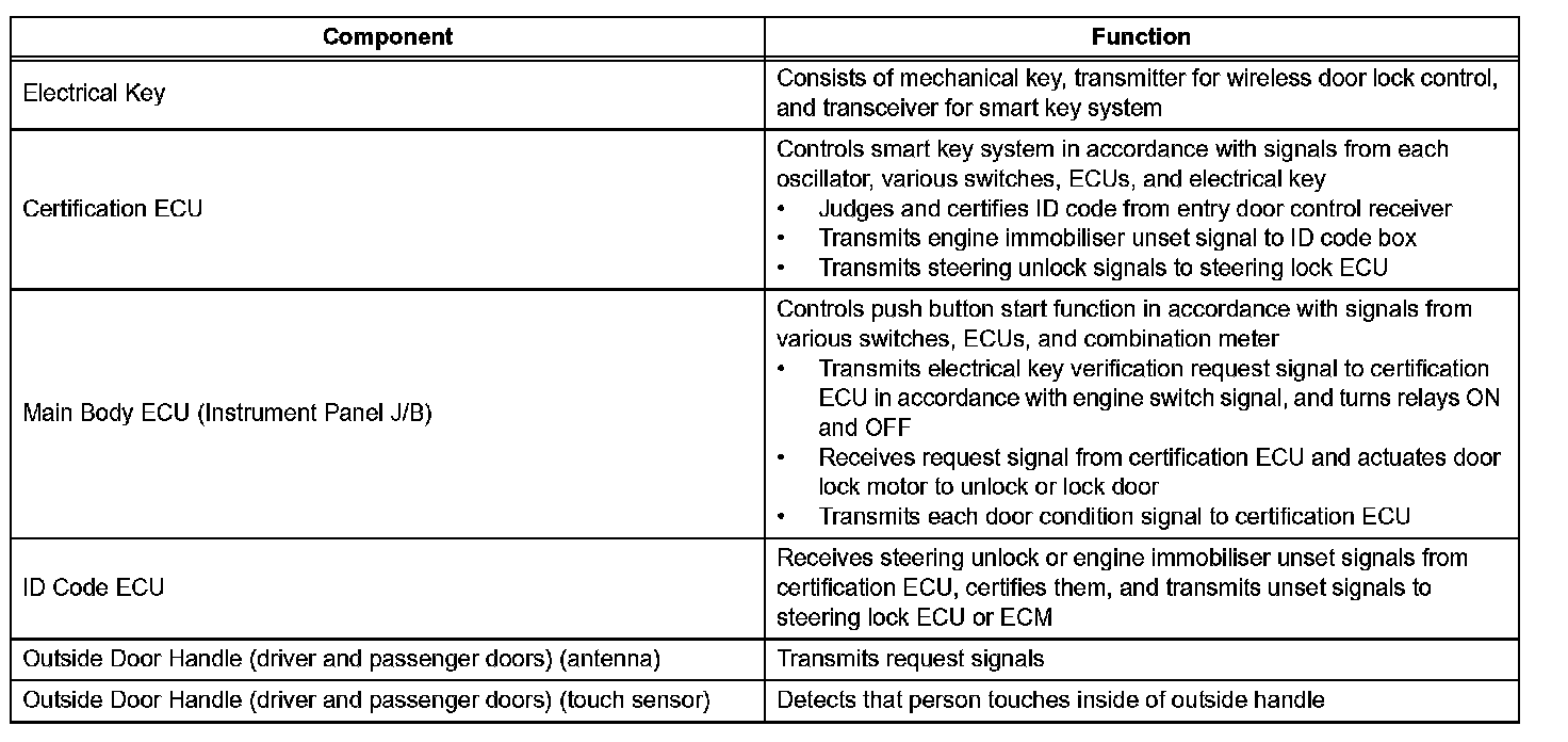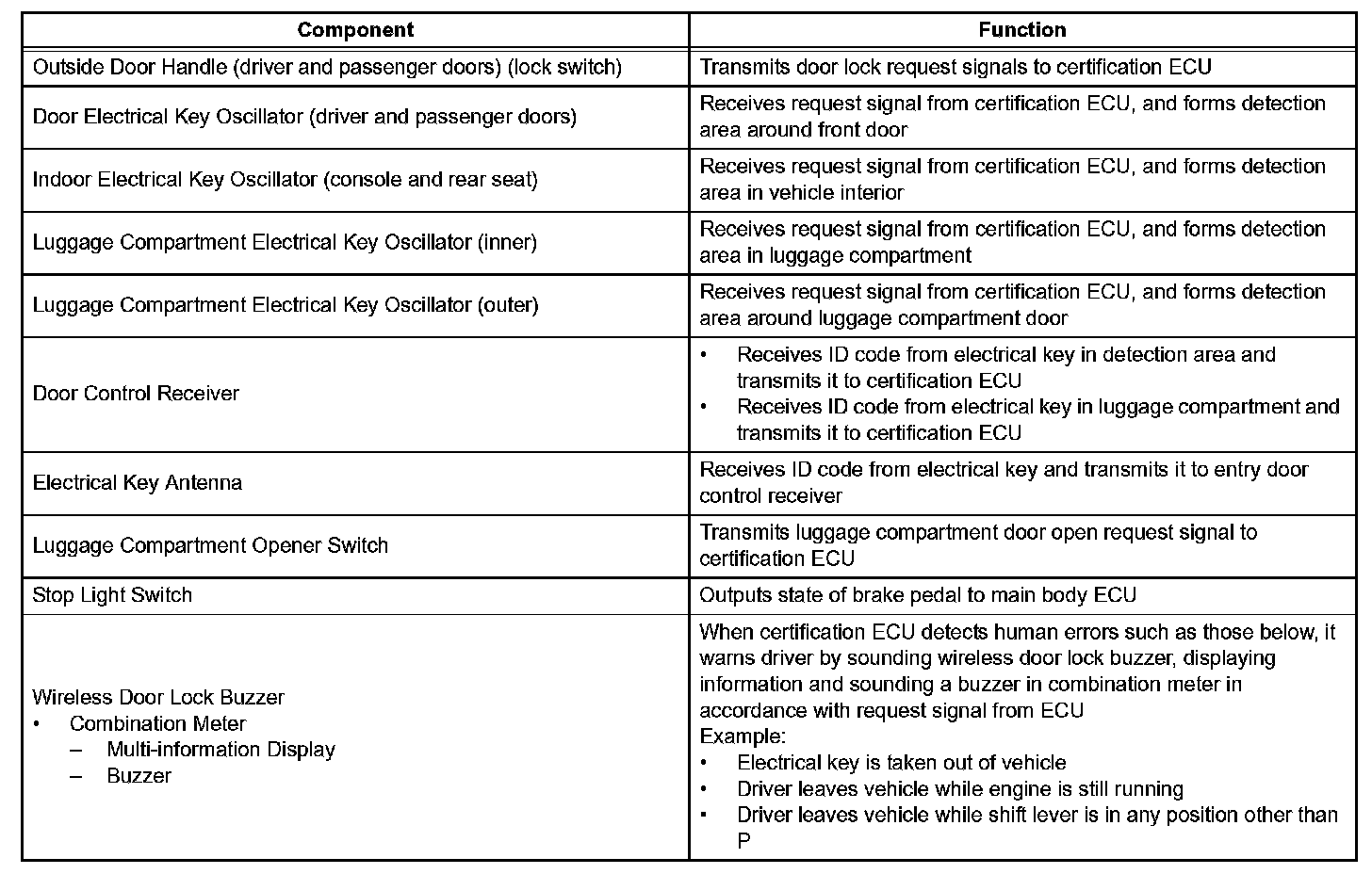 - This system is controlled by the certification ECU. When the certification ECU detects the presence of an electrical key in one of the detection areas, it identifies and checks the ID code, and outputs operation signals to the related ECU in accordance with their functions.