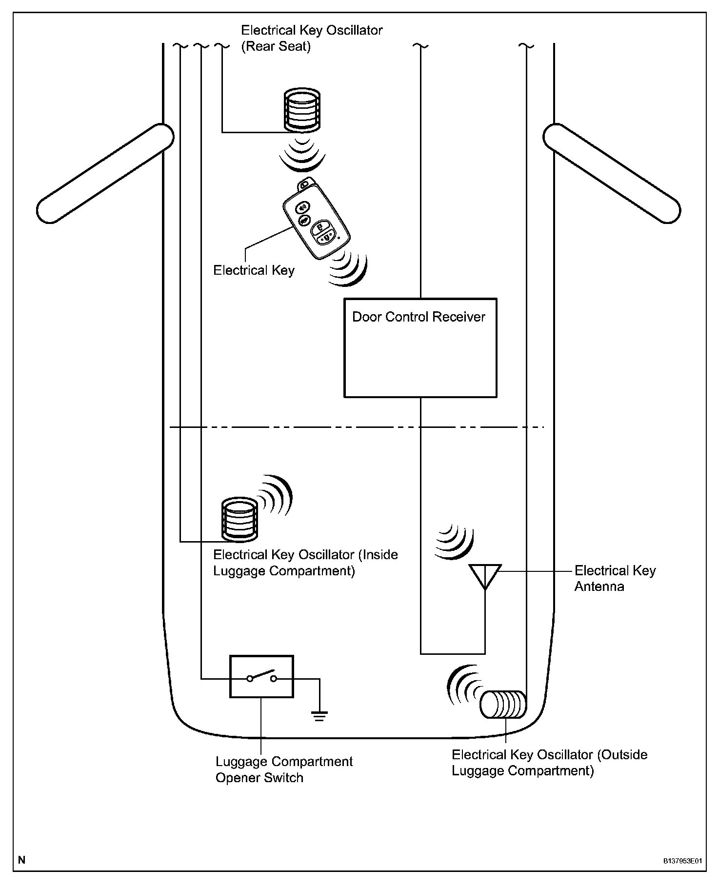 - The detection area of front door oscillator is formed by transmitting a request signal every 0.25 seconds while the engine switch is off and each door is locked. In this way, it detects the proximity of an electrical key. During entry lock, the detection area is formed with the lock switch on.