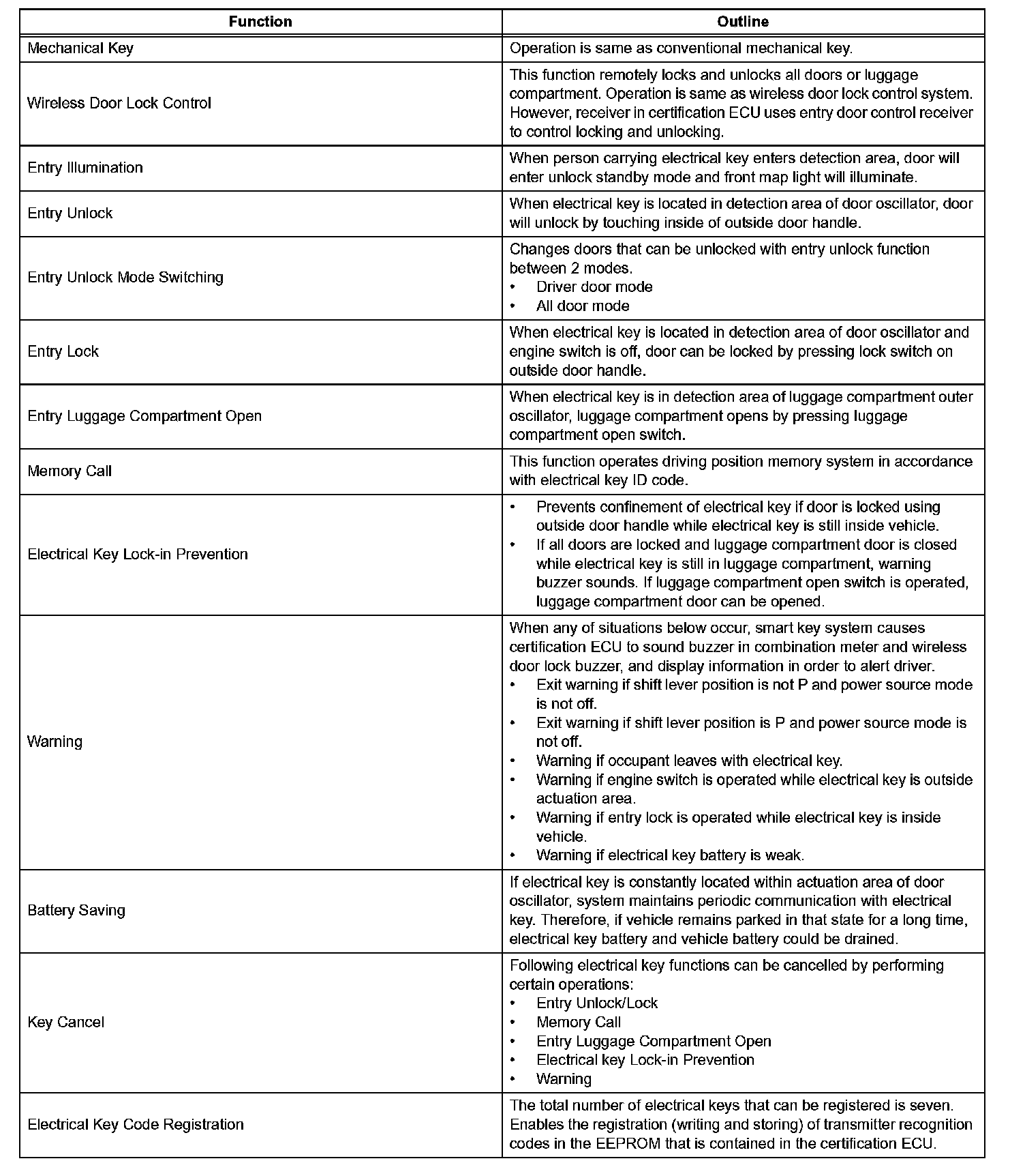 a. In addition to conventional mechanical key and wireless door lock control functions, the smart key system enables door locking/unlocking, steering lock releasing, engine starting, and luggage compartment door opening without operating the electrical key. The only requirement is that the electrical key is in the user's possession.