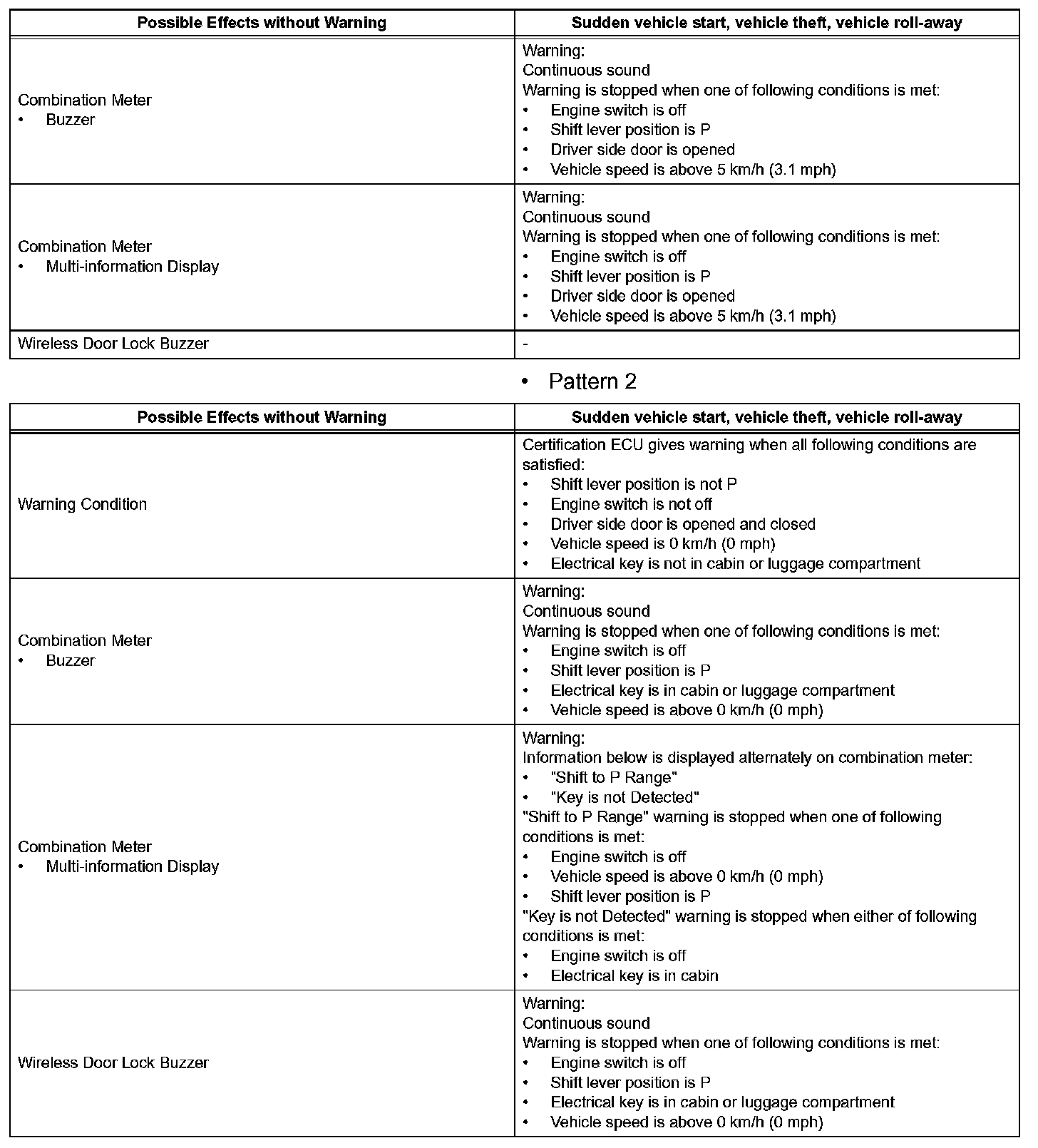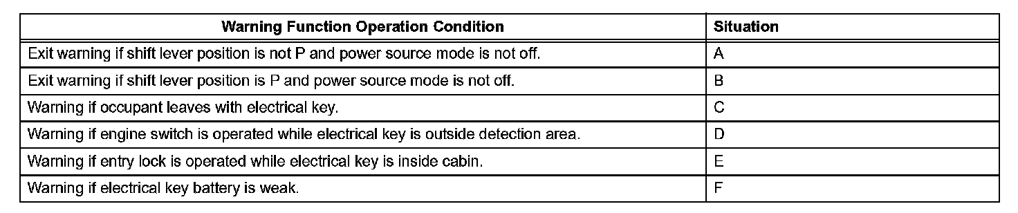 a. General When any of the situations occur, the smart key system causes the certification ECU to sound the buzzer in the combination meter and the wireless door lock buzzer, and illuminate the combination meter's multi-information display in order to alert the driver.