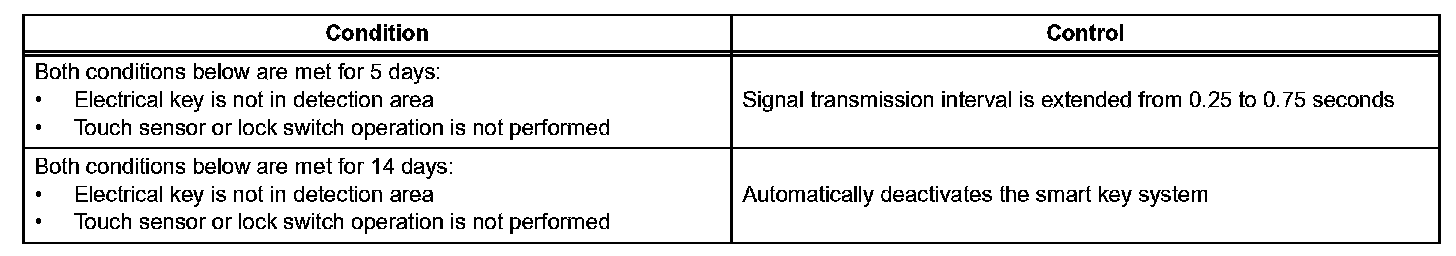 a. Vehicle Battery Saving Function In the smart key system, signals are emitted outside of the vehicle at a prescribed interval (0.25 seconds) when the doors are locked. Therefore, the vehicle battery could be drained if the vehicle remains parked for a long time. For this reason, the controls listed are carried out: