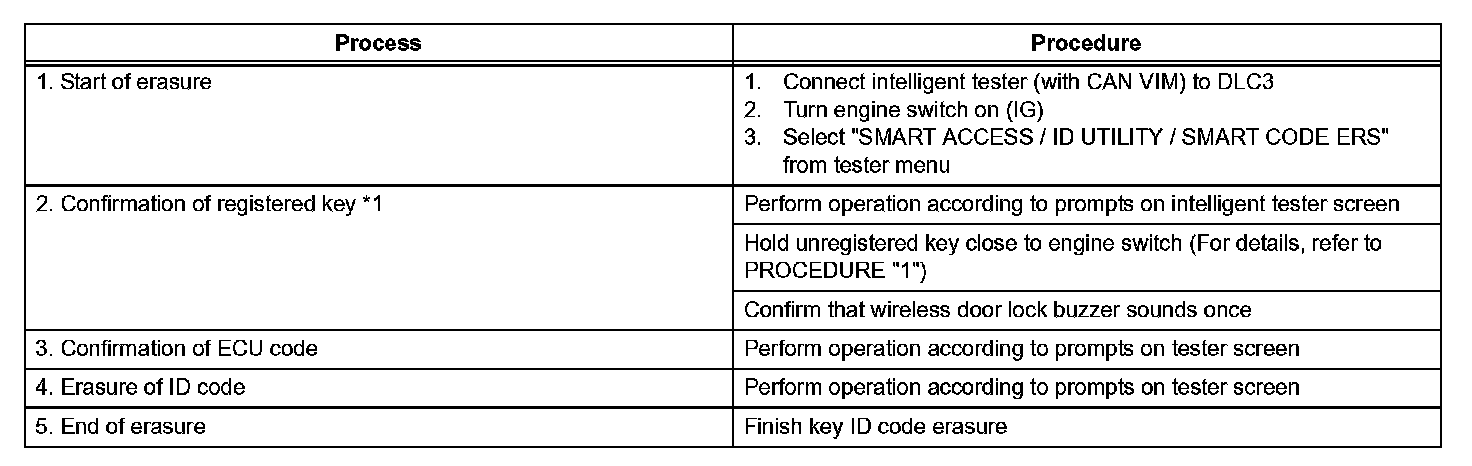*1: Perform this process for one of the keys registered for the vehicle. Finish the procedure within 30 seconds. If the procedure has not been finished within the specified time, perform erasure procedures from process 1 again.