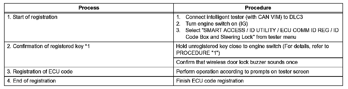 - The given procedures indicated in the table require the use of the intelligent tester: New key ID registration Additional key ID registration Key ID erasure ECU code registration.