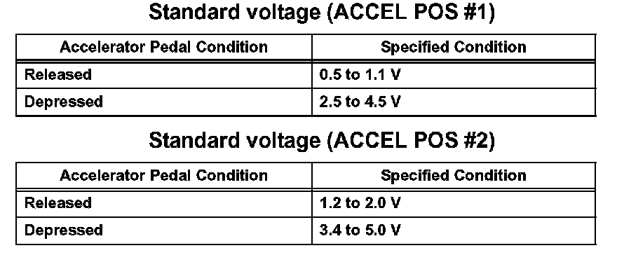 5. Operate the accelerator pedal, and then check that the ACCEL POS #1 and ACCEL POS #2 values are within the specifications.