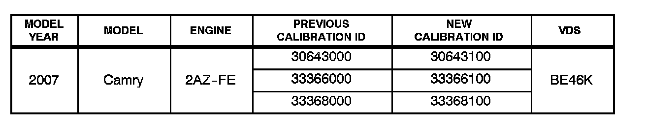 ^ 2007 model year Camry vehicles equipped with 2AZ-FE engine and 5-speed automatic transmission produced BEFORE the Production Change Effective VINs shown below.