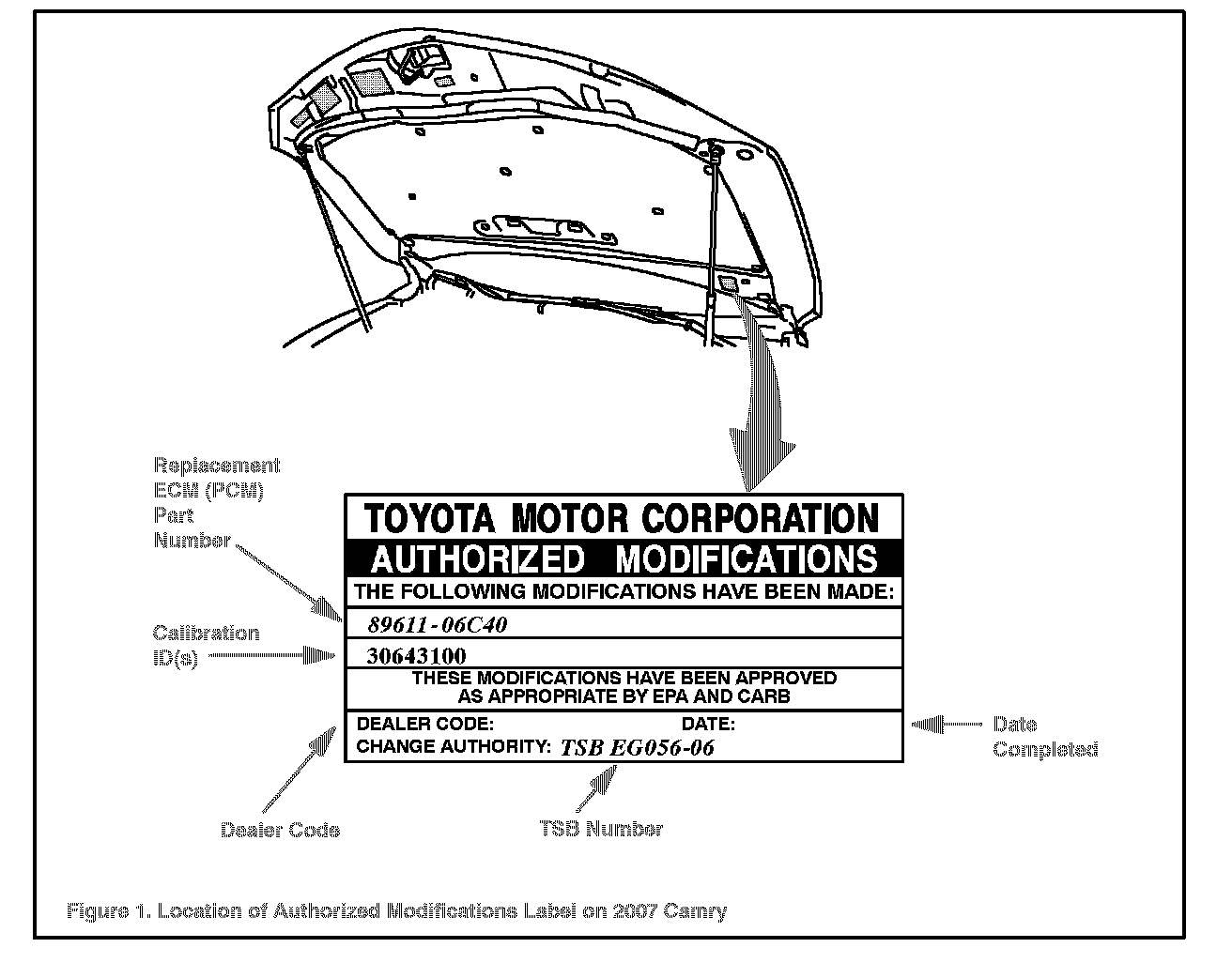 1. Check for the Authorized Modifications Label affixed to the vehicle in the location shown in Figure 1. Confirm if the ECM (PC M) calibration has been updated. If NOT the latest ECM (PCM) calibration go to step 2.