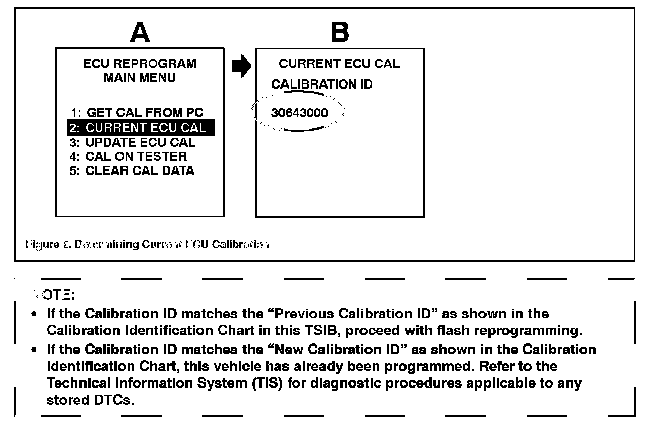 2. Connect the Diagnostic Tester to the vehicle and select CURRENT ECU CAL from the ECU REPROGRAM MAIN MENU. Determine the vehicle's current ECU calibrations (see Figure 2).
