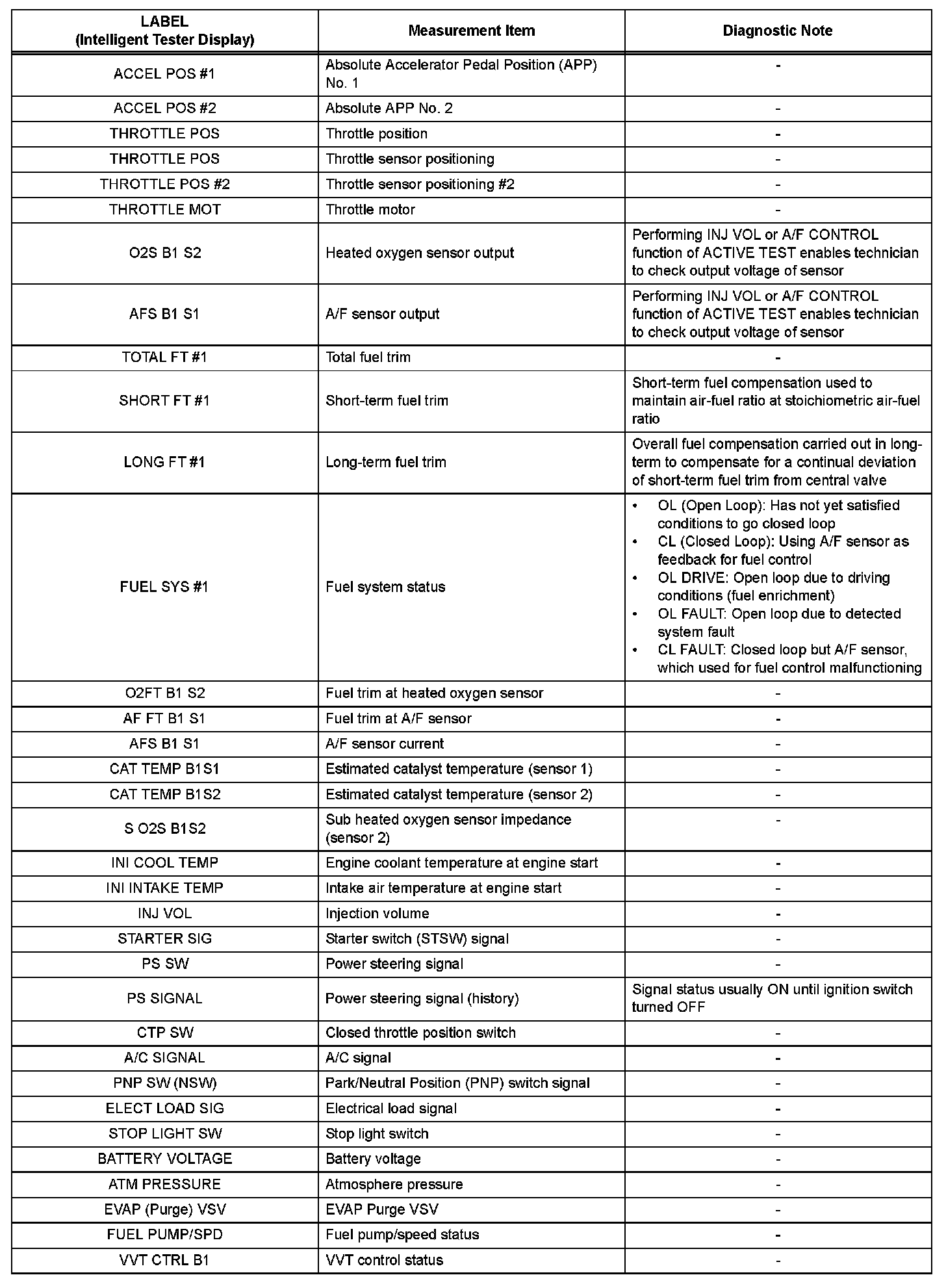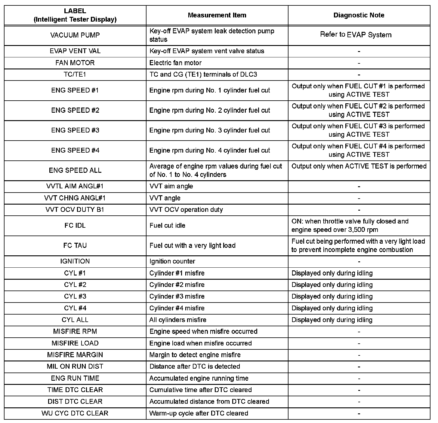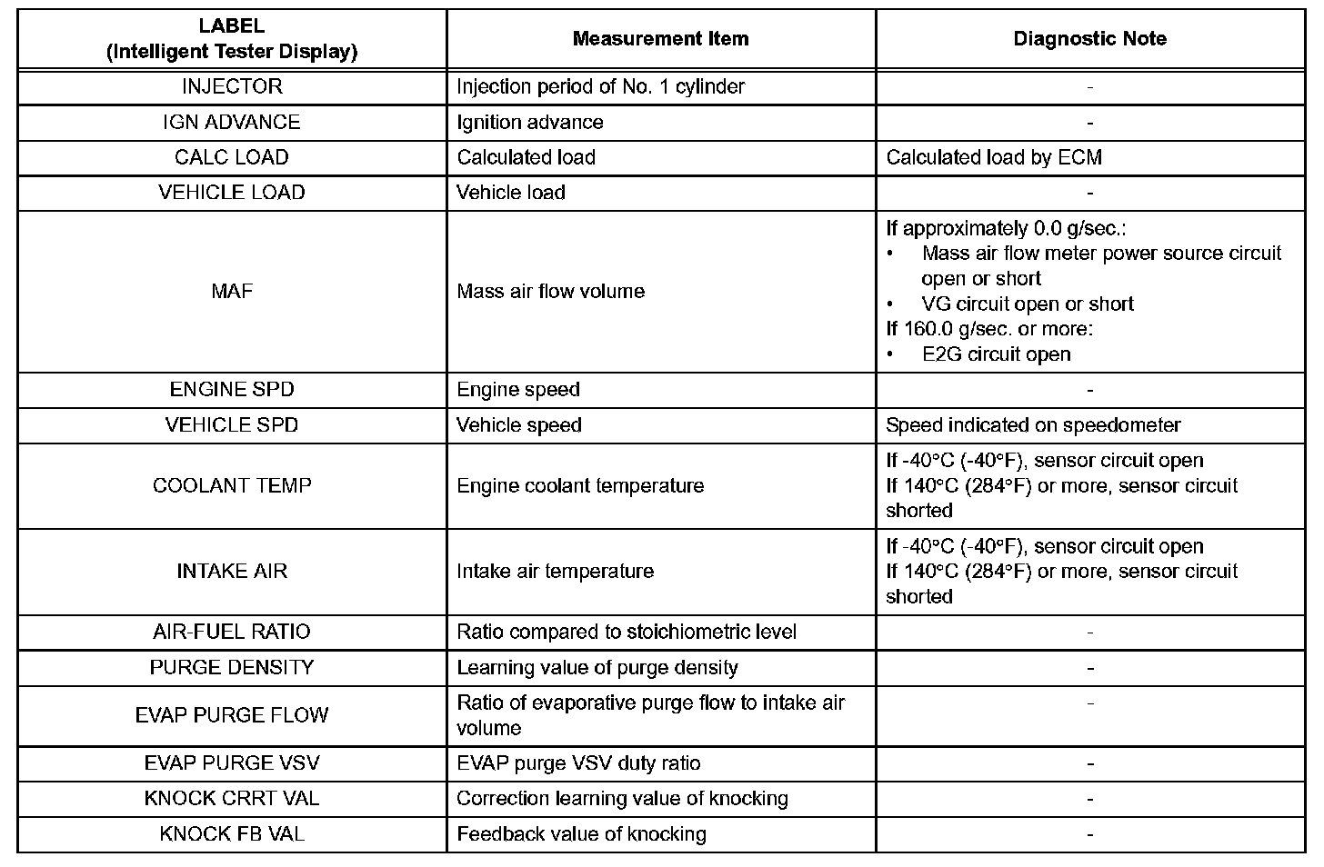 The ECM records vehicle and driving condition information as freeze frame data the moment a DTC is stored. When troubleshooting, freeze frame data can be helpful in determining whether the vehicle was running or stopped, whether the air-fuel ratio was lean or rich, as well as other data recorded at the time of a malfunction.