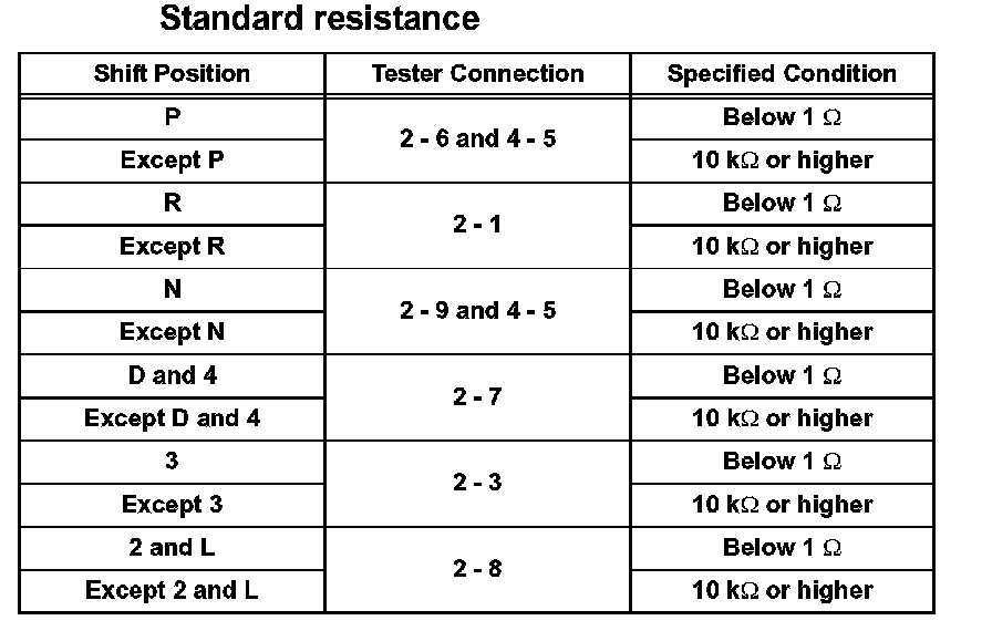 (c) Measure the resistance according to the values(s) in the table below when the shift lever is moved to each position.