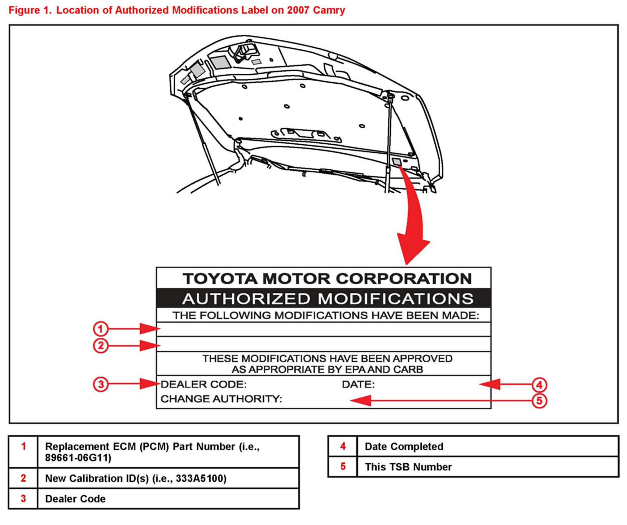 1. Check for the Authorized Modifications Label affixed to the vehicle in the location shown in Figure 1. Confirm if the ECM (PCM) calibration has been updated. If the calibration ID listed is NOT the latest ECM (PCM) calibration - go to step 2.