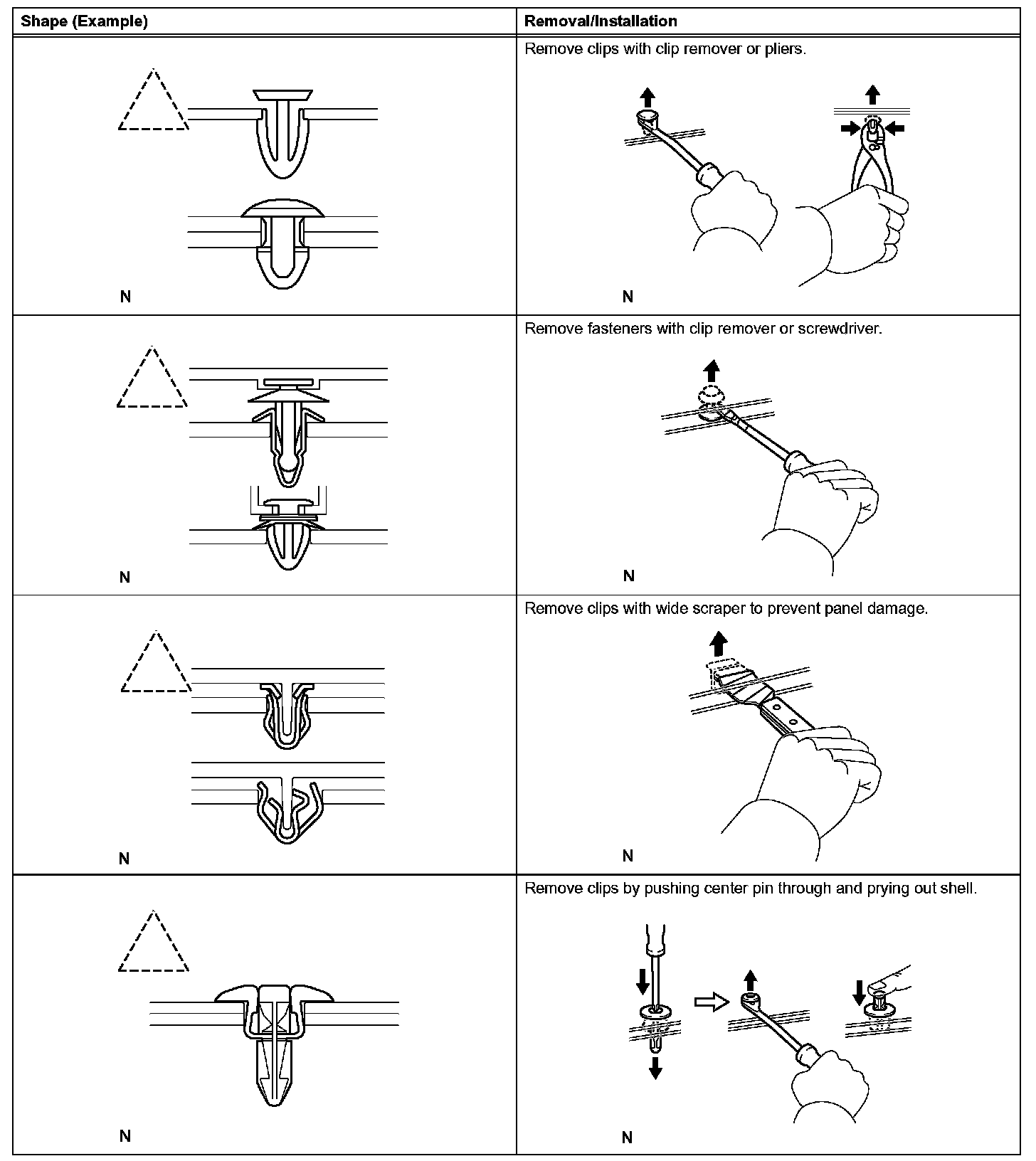 1. The removal and installation methods of typical clips used for vehicle body parts are shown in the table.