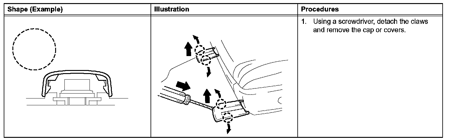 1. The removal and installation methods of typical claws used for vehicle body parts are shown in the table.