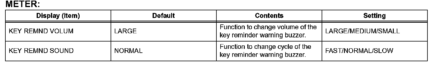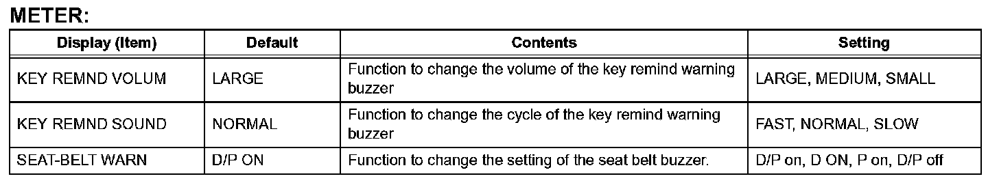 - When either the battery cable or the combination meter connector is disconnected, these buzzers are set on (enabled).
