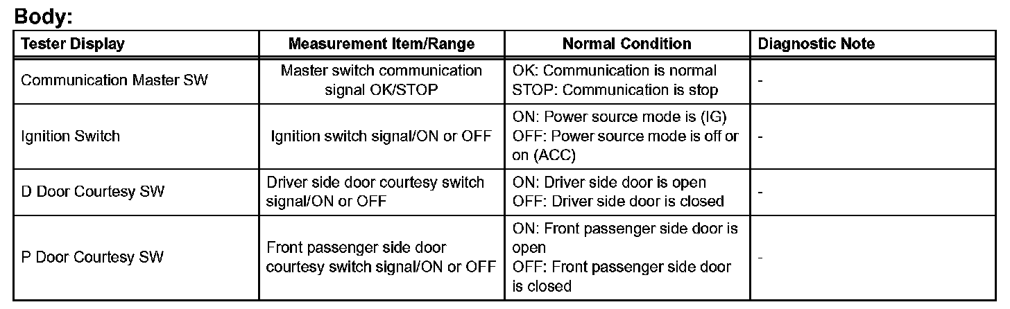 HINT: Using the DATA LIST displayed on the intelligent tester, the value of the switches, sensors, actuators, etc. can be read without part removal. Reading the DATA LIST as the first step in troubleshooting is one way to shorten the labor time.