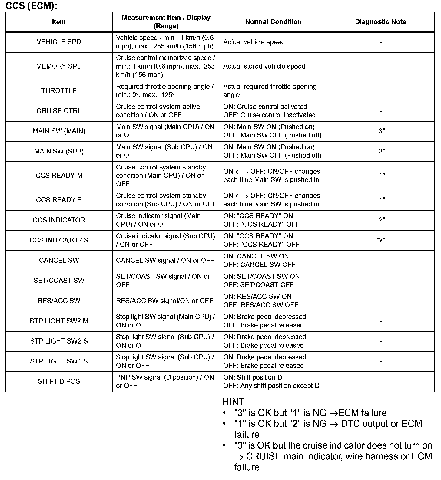 DATA LISTWhile the intelligent tester is connected to the DLC3 with the ignition switch in the ON position, the CRUISE CONTROL data list can be displayed. Follow the prompts on the tester screen to access the data list.
