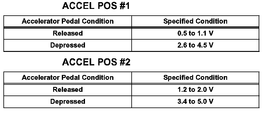 5. Operate the accelerator pedal, then check that of the ACCEL POS #1 and ACCEL POS #2 values are within the specified values.