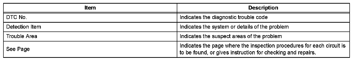 Look for output Diagnostic Trouble Codes (DTCs) (from the DTC checks) in the appropriate section's Diagnostic Trouble Code Chart. Use the chart to determine the trouble area and the proper inspection procedure. A description of each of the chart's columns is shown in the table.