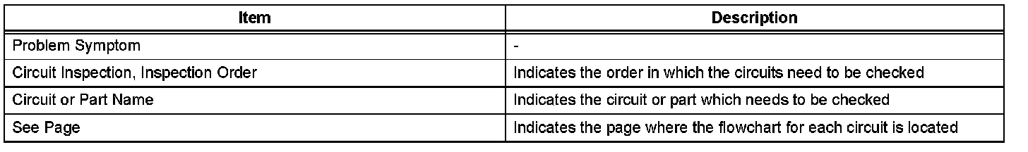 PROBLEM SYMPTOMS TABLEWhen a "Normal" code is output during a DTC check but the problem still occurs, use the Problem Symptoms Table. The suspected areas (circuits or parts) for each problem symptoms are in the table. The suspected areas are listed in order of probability. A description of each of the chart's columns is shown in the table.