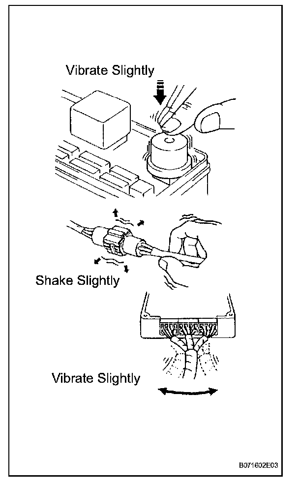 For example: With a problem that only occurs when the engine is cold or as a result of vibration caused by the road during driving, the problem can never be determined if the symptoms are being checked on a stationary vehicle or a vehicle with a warmed-up engine. Vibration, heat or water penetration (moisture) is difficult to reproduce. The symptom simulation tests below are effective substitutes for the conditions and can be applied on a stationary vehicle. Important points in the symptom simulation test: