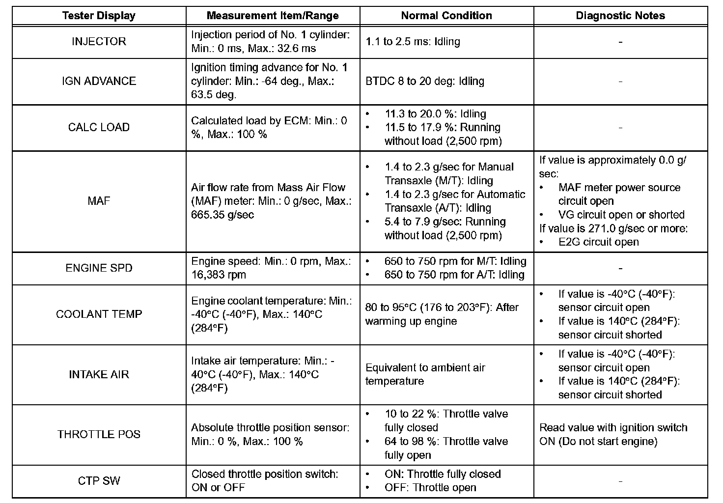 DATA LISTHINT: By reading the DATA LIST displayed on an intelligent tester or OBD II scan tool, you can check values, including those of the switches, sensors, and actuators, without removing any parts. Reading the DATA LIST as the first step of troubleshooting is one method of shortening diagnostic time.