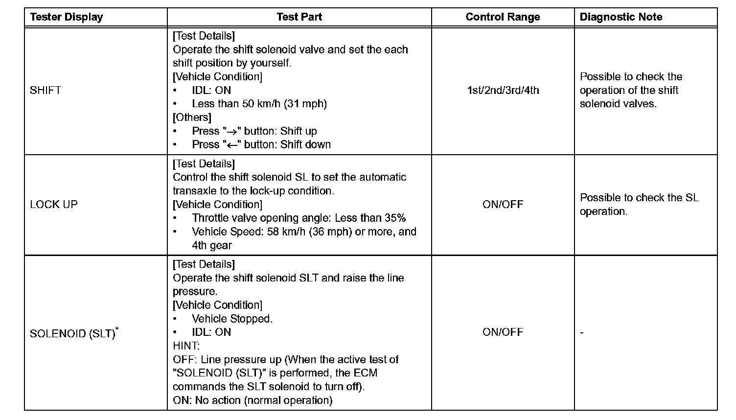 *: "SOLENOID (SLT)" in the ACTIVE TEST is performed to check the line pressure changes by connecting the SST to the automatic transaxle, which is used in the HYDRAULIC TEST as well. Hydraulic Test