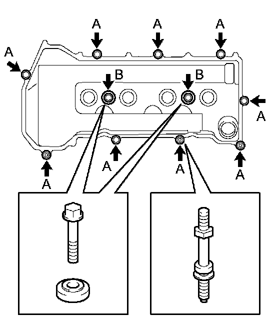 Using several steps, uniformly install and tighten the 10 cylinder head bolts and plate washers with a bi-hexagon wrench 10 mm in the sequence shown in the illustration (Procedure "A").
