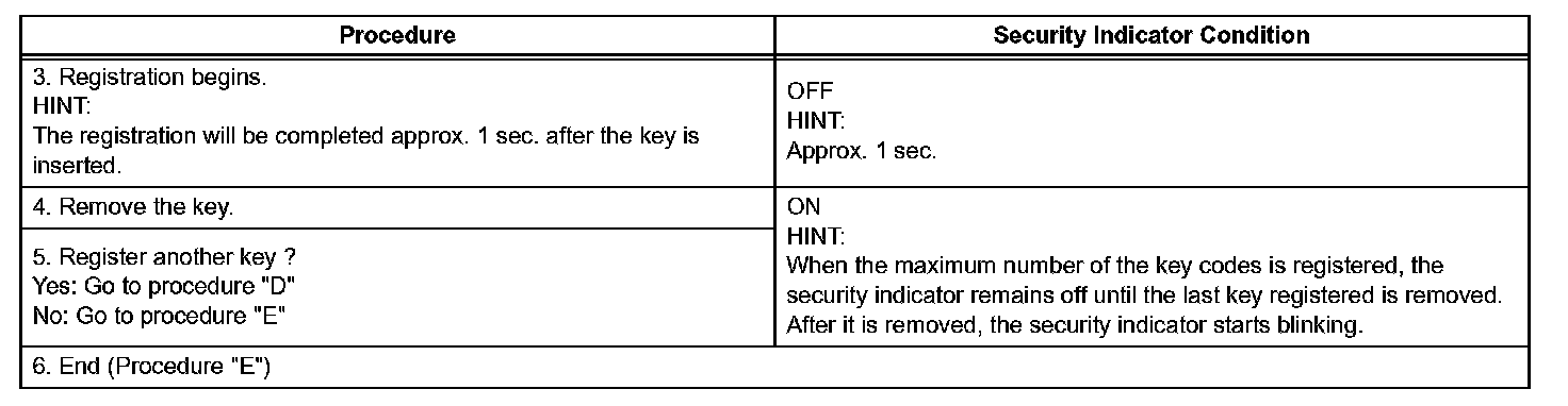 NOTE: If the key code registration has failed in automatic key code registration mode, code 2-1 will be output from the security indicator. Trying to register an already registered key will cause code 2-2 to be output when the key is inserted. If the number of registered key codes exceeds the limit, code 2-3 will be output from the security indicator. The output details are shown in procedure "B".
