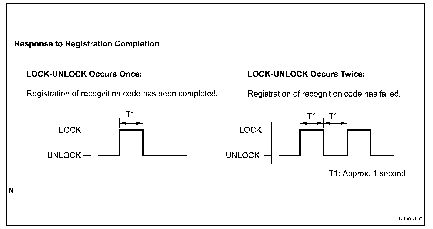 2. Within 3 seconds after the transmitter switch has been released, the LOCK-UNLOCK operation will be automatically performed once if the registration of the recognition code of the transmitter is completed correctly. In case the LOCK-UNLOCK operation is performed twice, the registration of recognition code has failed. Perform the registration procedure from the beginning once again (Procedure "B").