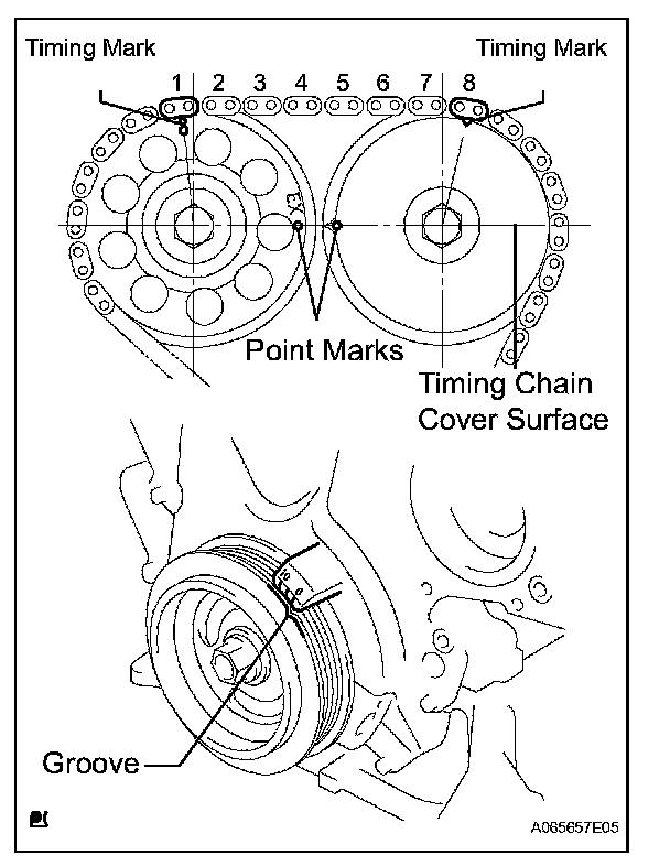 (b) Check that the point marks of the camshaft timing gears are in a straight line on the timing chain cover surface as shown in the illustration.