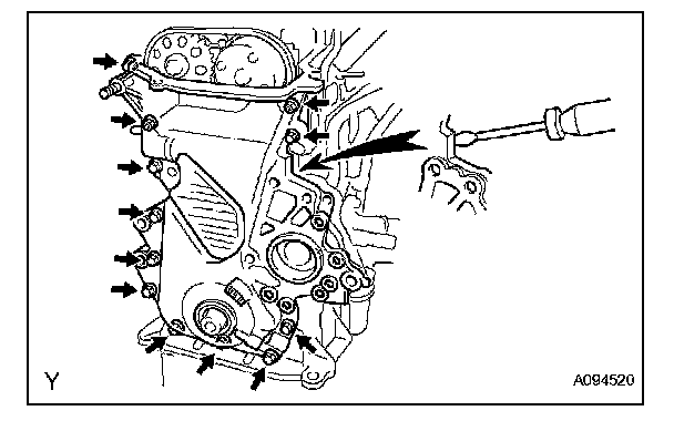 (c) Remove the timing chain cover by prying the portions between the timing chain cover, cylinder head and cylinder block with a screwdriver.