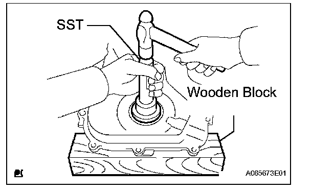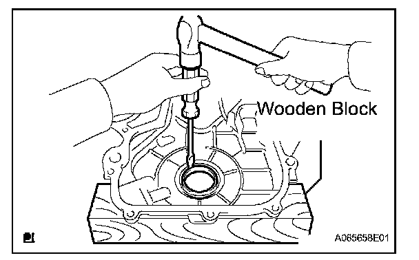 (c) Using SST, tap the oil seal in until its surface is flush with the timing chain cover edge.