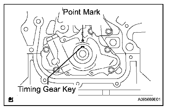 (2) Using a crankshaft pulley bolt, turn the crankshaft to align the timing gear key with the point mark on the oil pump.