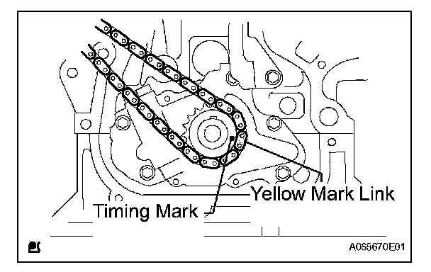(b) Install the chain onto the crankshaft timing gear with the yellow mark link aligned with the timing mark on the crankshaft timing gear.