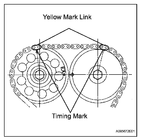 (d) Install the chain onto the camshaft timing gears with the yellow mark links aligned with the timing marks on the camshaft timing gears.