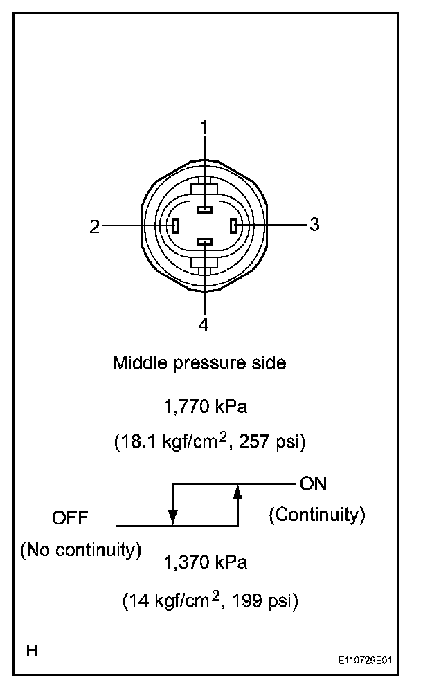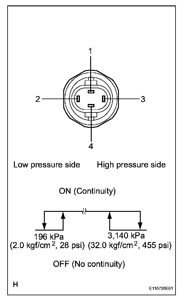 3. Check continuity between the terminals when refrigerant pressure is changed, as shown in the illustration.