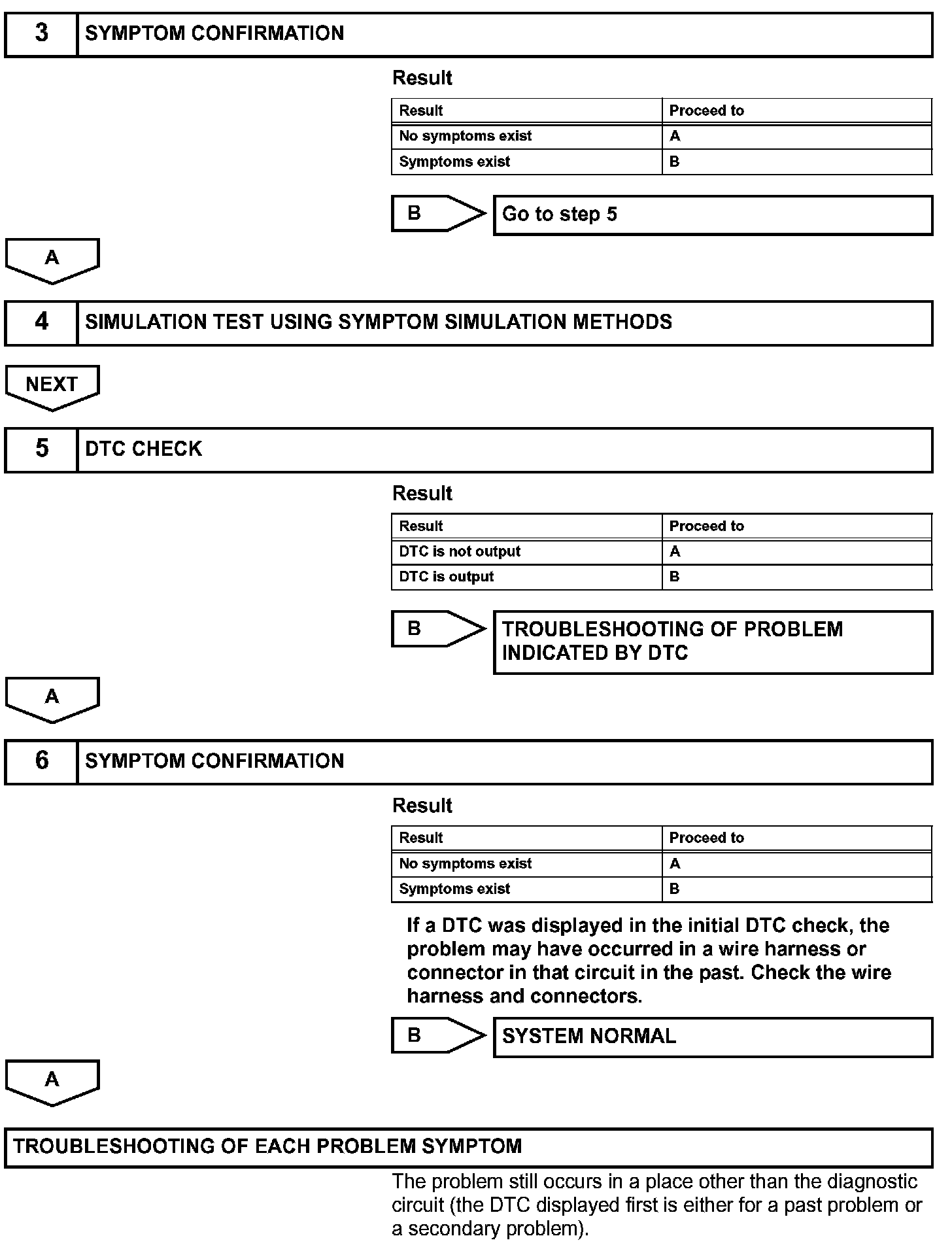 - In the DTC check, it is very important to determine whether the problem indicated by the DTC either: 1) still occurs, or 2) occurred in the past but has returned to normal. In addition, the DTC should be compared to the problem symptom to see if they are related. For this reason, DTCs should be checked before and after confirmation of symptoms (i. e. , whether or not problem symptoms exist) to determine current system conditions, as shown in the flowchart.