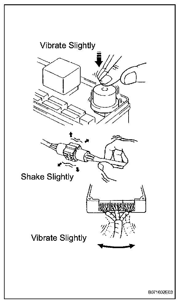 For example: With a problem that only occurs when the engine is cold or as a result of vibration caused by the road during driving, the problem can never be determined if the symptoms are being checked on a stationary vehicle or a vehicle with a warmed-up engine. Vibration, heat or water penetration (moisture) is difficult to reproduce. The symptom simulation tests below are effective substitutes for the conditions and can be applied on a stationary vehicle. Important points in the symptom simulation test: