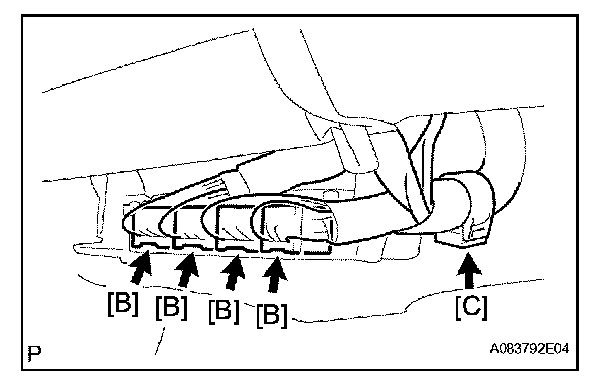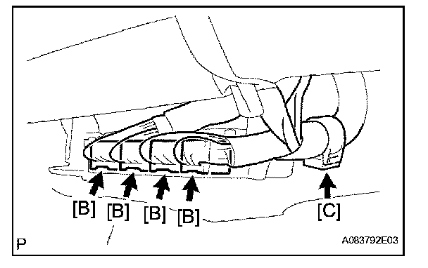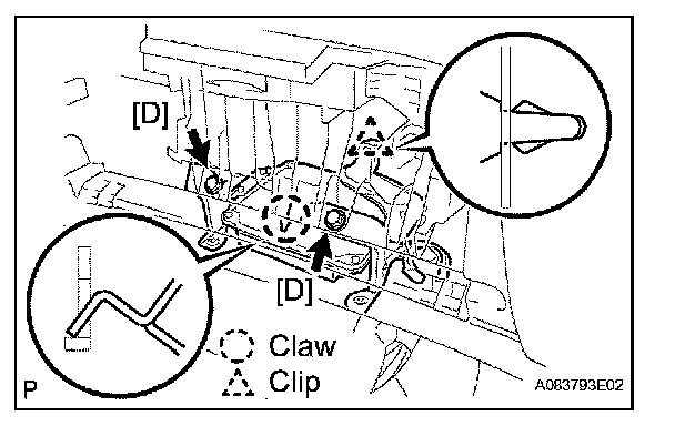 b. Deform the upper part of the glove compartment door assembly to release the stoppers [B].