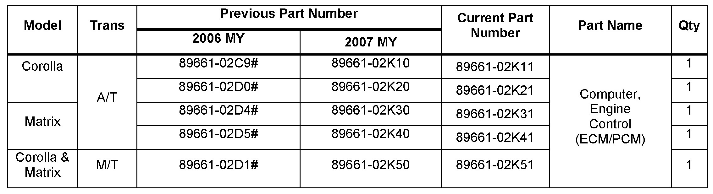- 2006 - 2007 model year Corolla and Matrix (2WD) vehicles equipped with the 1ZZ-FE engine and produced BEFORE the Production Change Effective VINs shown below.