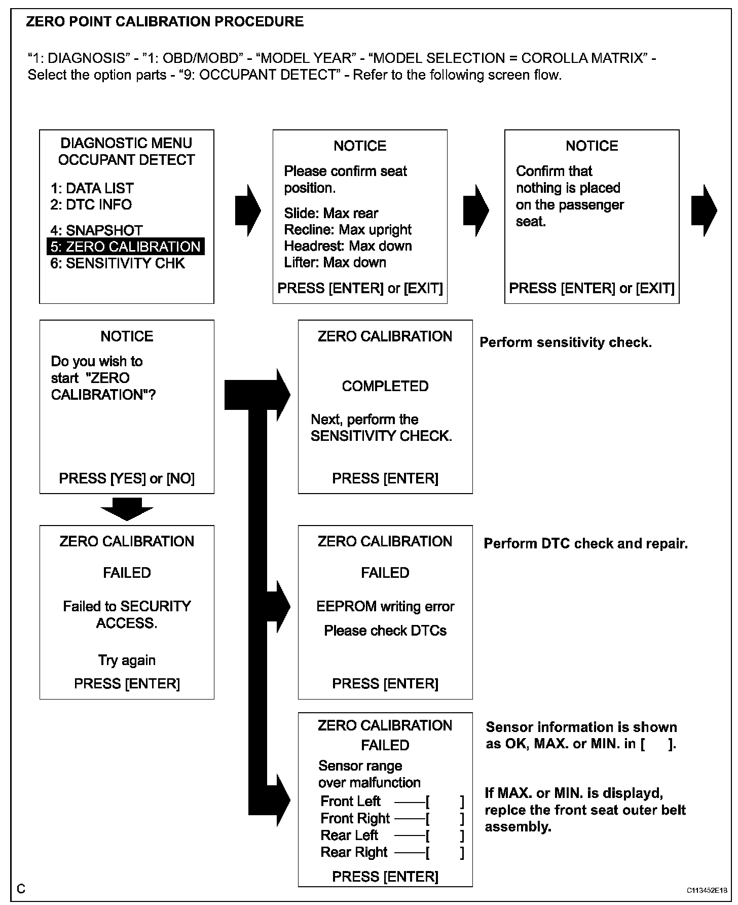 - If zero point calibration has not finished normally, replace the front seat assembly RH.