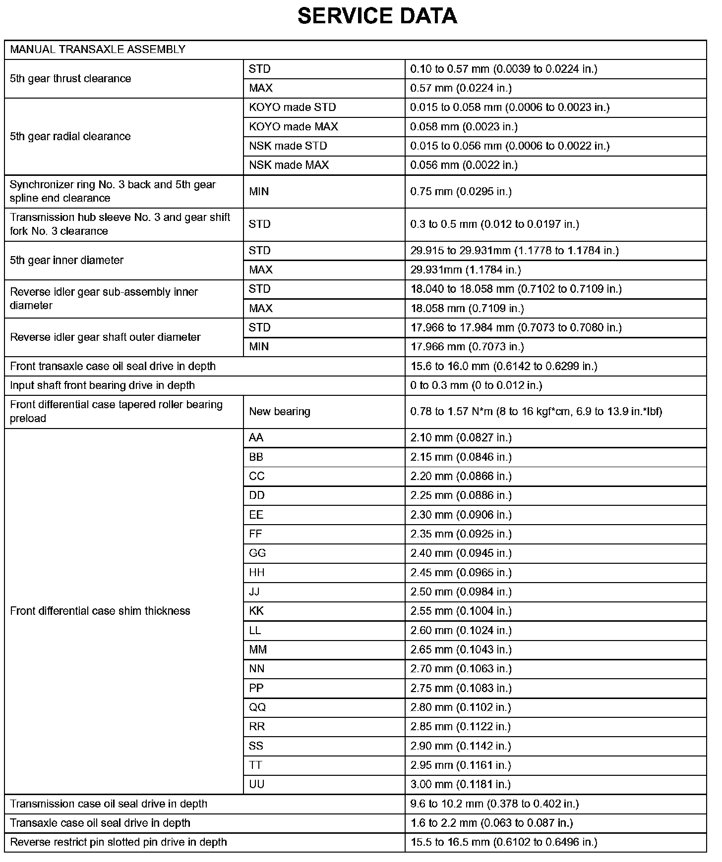 Manual Transaxle - Service Data (Part 1):