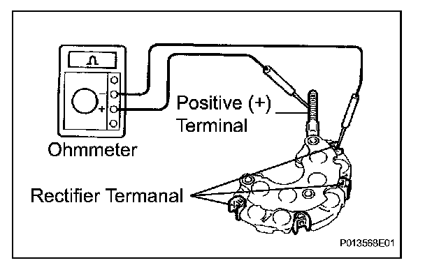 1. Using an ohmmeter, measure the resistance between the positive (+) terminal and each rectifier terminal.