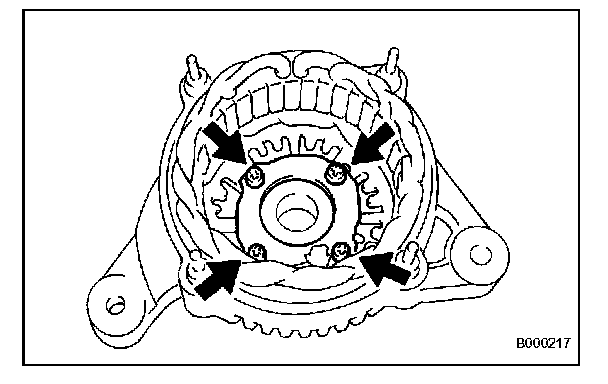 When the positive and negative poles of the positive (+) terminal and each rectifier terminal are switched over, there is a resistance of below 1 ohm in one direction but 10 k Ohms or higher in the other direction.