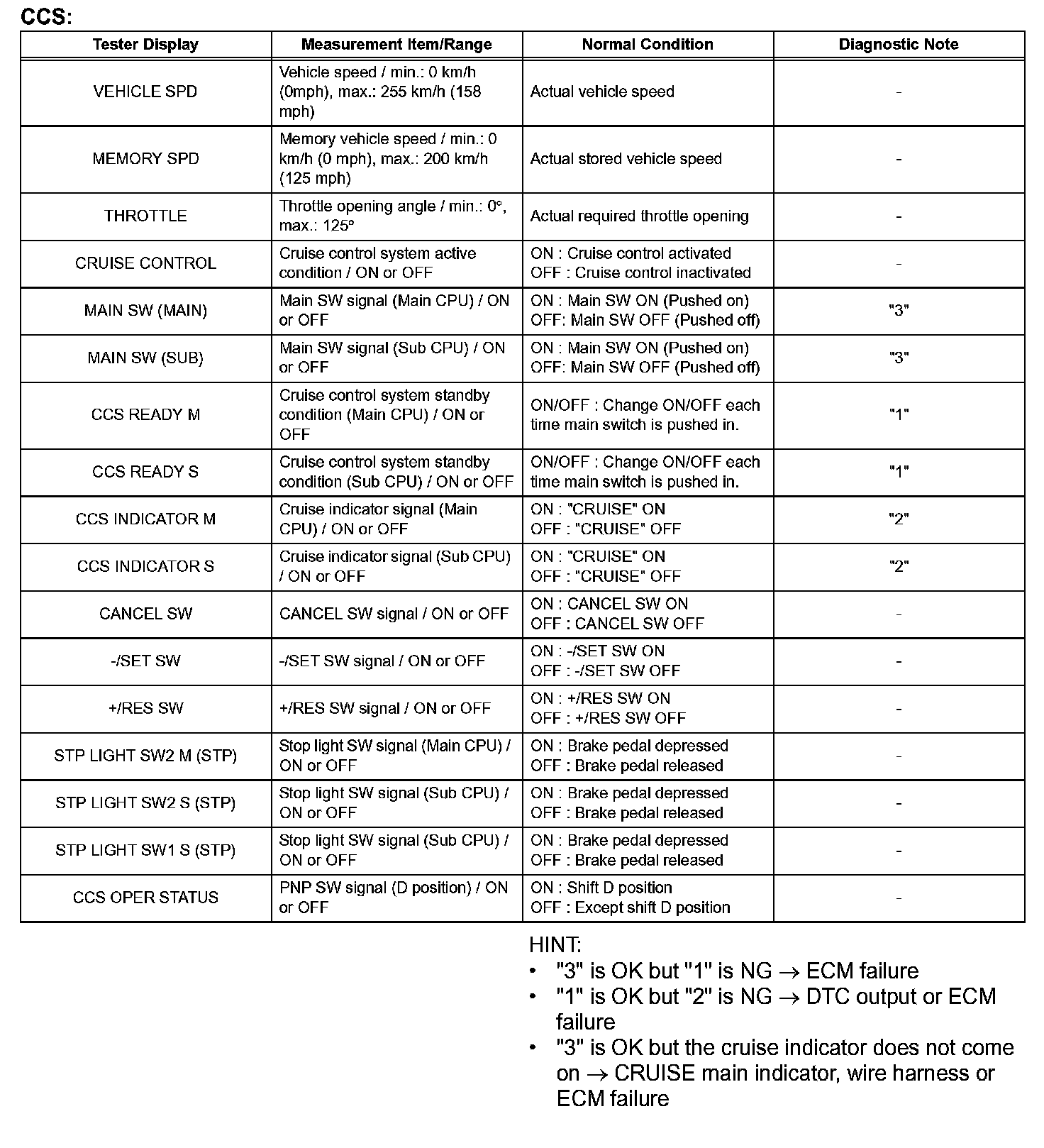 a. While the intelligent tester is connected to the DLC3 with the ignition switch in the ON position, the CRUISE CONTROL data list can be displayed. Follow the prompts on the tester screen to access the data list.