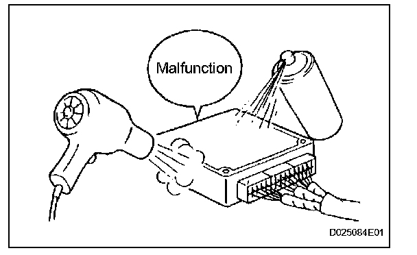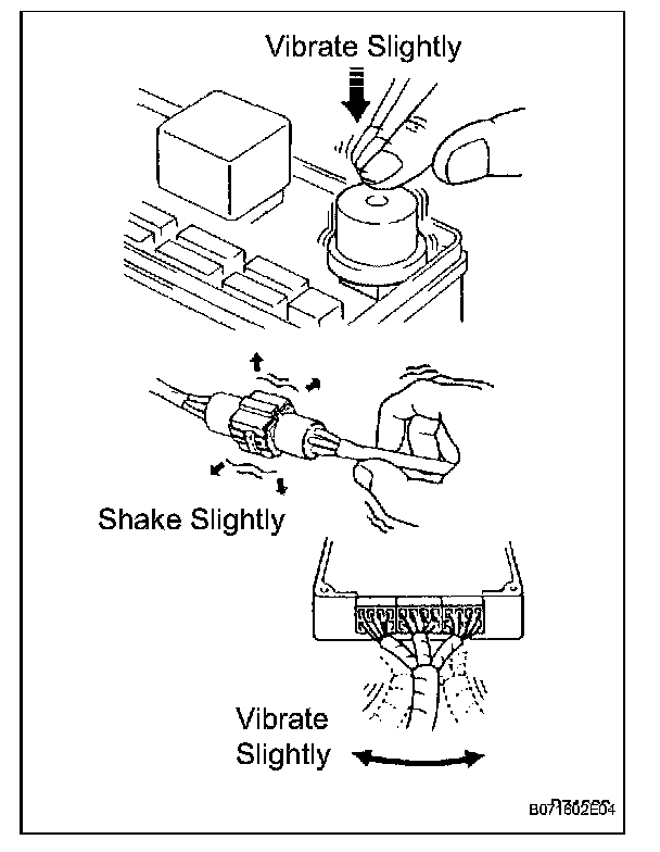 For example: With a problem that only occurs when the engine is cold or as a result of vibration caused by the road during driving, the problem can never be determined if the symptoms are being checked on a stationary vehicle or on a vehicle with a warmed up engine. Vibration, heat or water penetration (moisture) is difficult to reproduce. The symptom simulation tests below are effective substitutes for the conditions and can be applied on a stationary vehicle. Important points in the symptom simulation test: