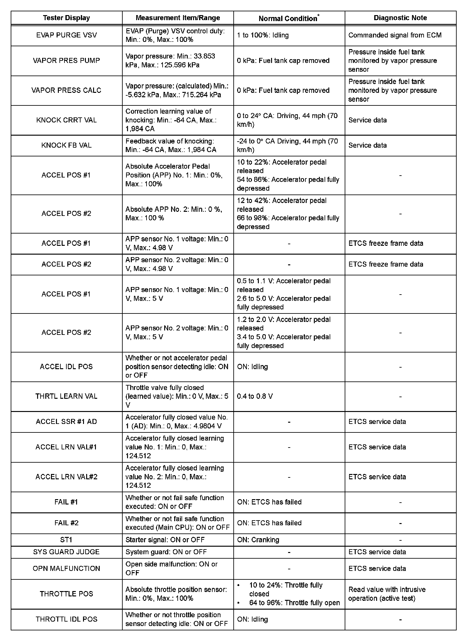 DATA LISTHINT: Reading the DATA LIST displayed on an intelligent tester enables values, including those of the switches, sensors, and actuators, to be checked without removing any parts. Reading the DATA LIST as the first step in troubleshooting is one method to shorten diagnostic time.