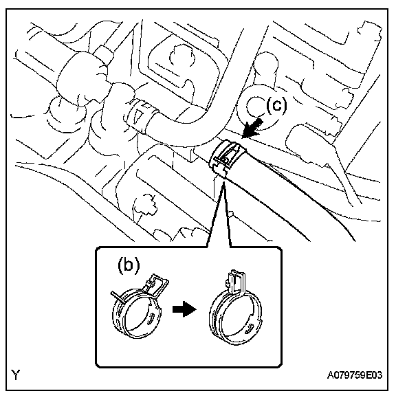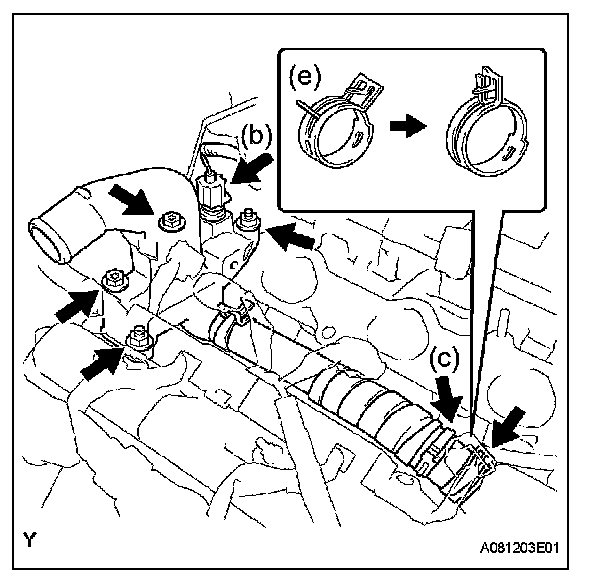 e. Lock the hose clamp as shown in the illustration. Then remove the water outlet together with the water by-pass hose No. 1.